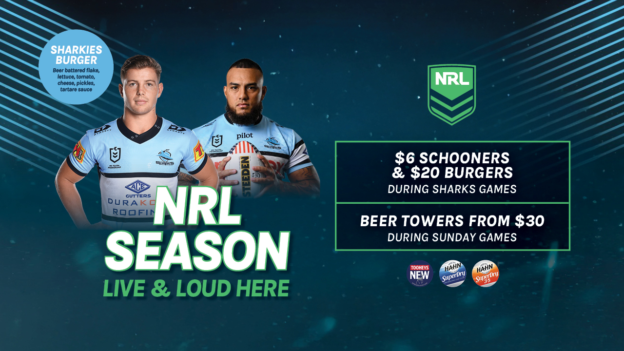 Watch the 2026 NRL season LIVE & LOUD at Union Place Hotel with $6 schooners of selected beers and $20 burgers during live Cronulla Sharks games, plus Beer Towers from $30 available during Sunday games.