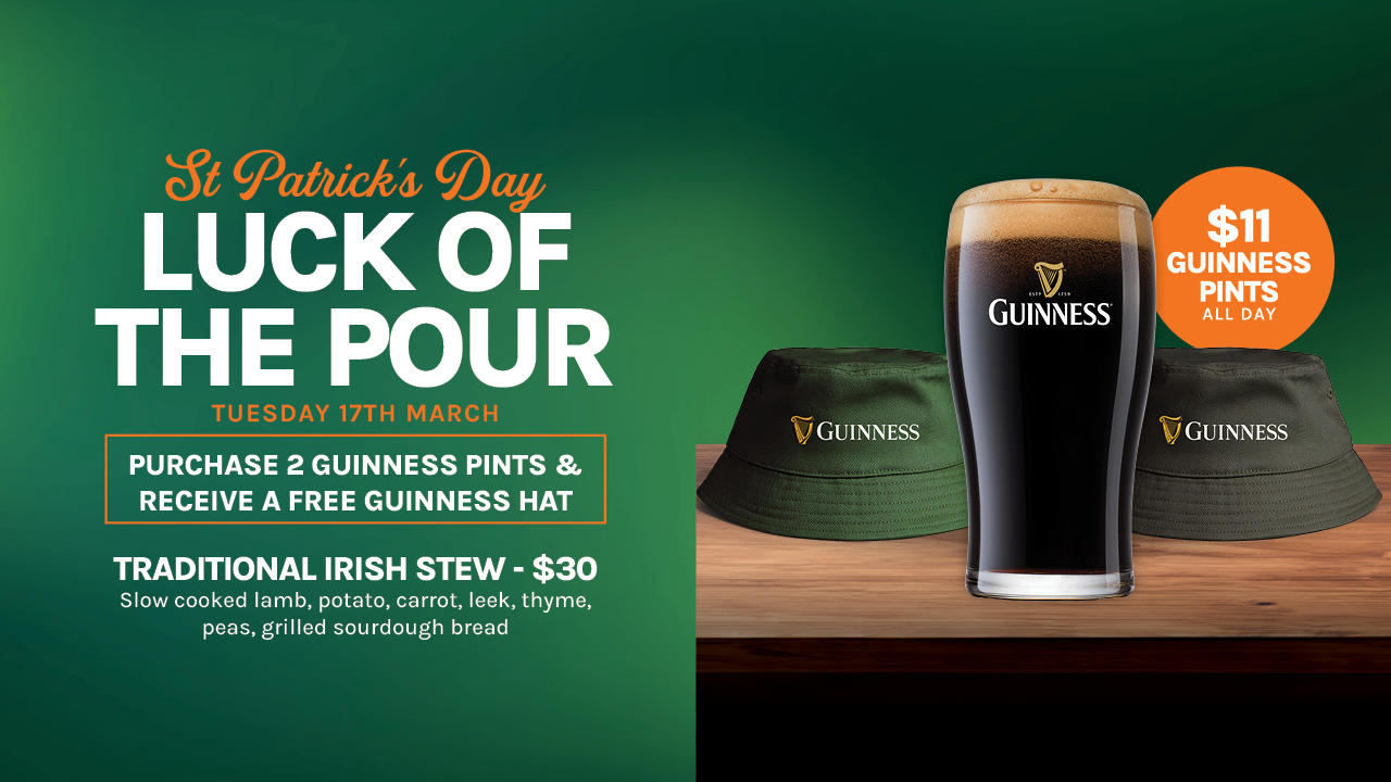 Enjoy $11 pints of Guinness all day and tuck into a hearty Traditional Irish Stew for $30, slow cooked with lamb, potato, carrot, leek, thyme and peas, served with grilled sourdough.